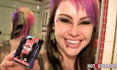 Green Haired Goth Babe with Tattoos and Piercings Blows A Load