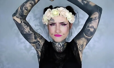 Hot black-haired tattooed TS fucking her ass with a big sextoy